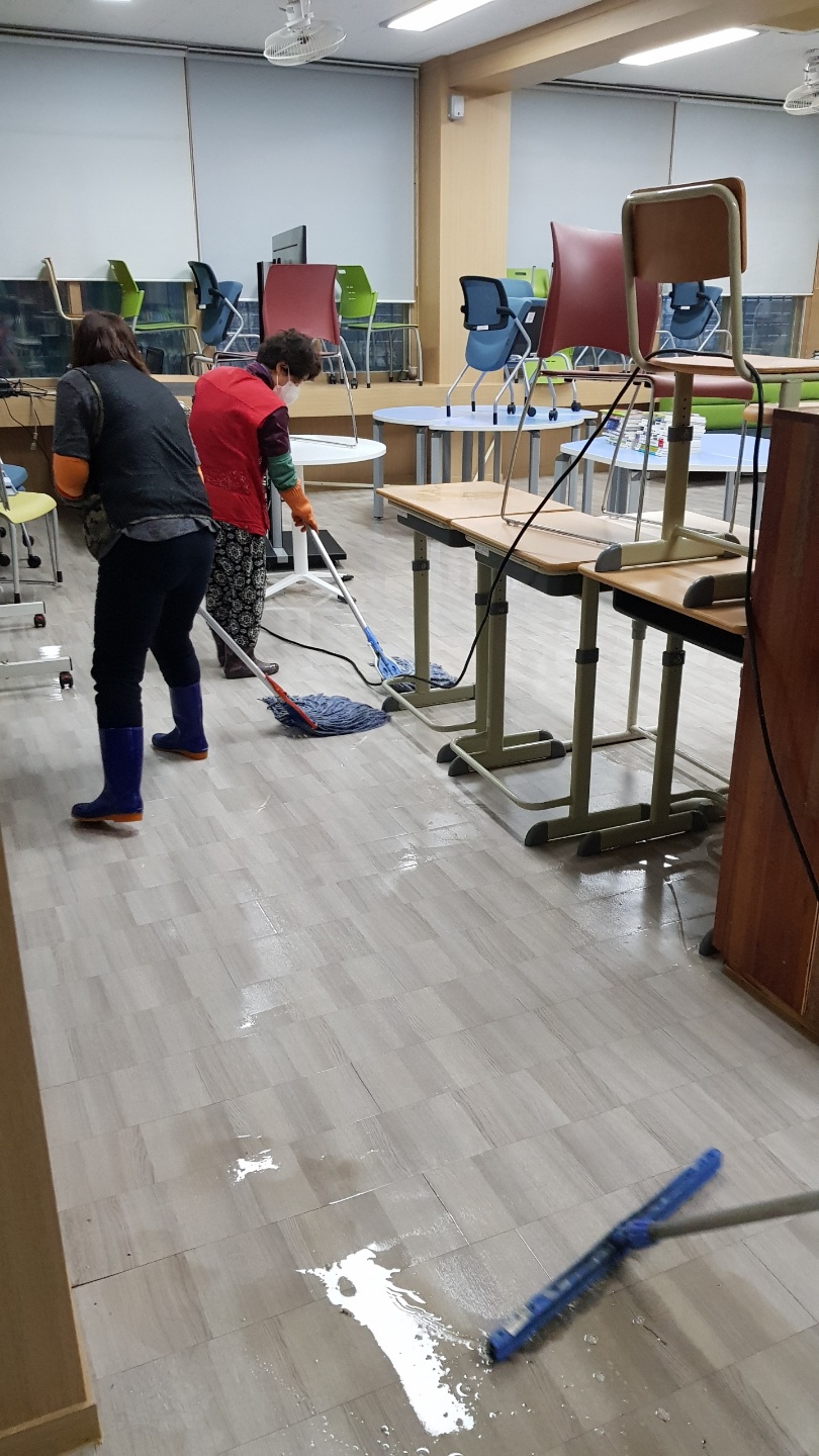 ▶ 기계가 닿지 않는 부분은 수세미/ 헤라 등을 이용해 오염물질을 제거한다.